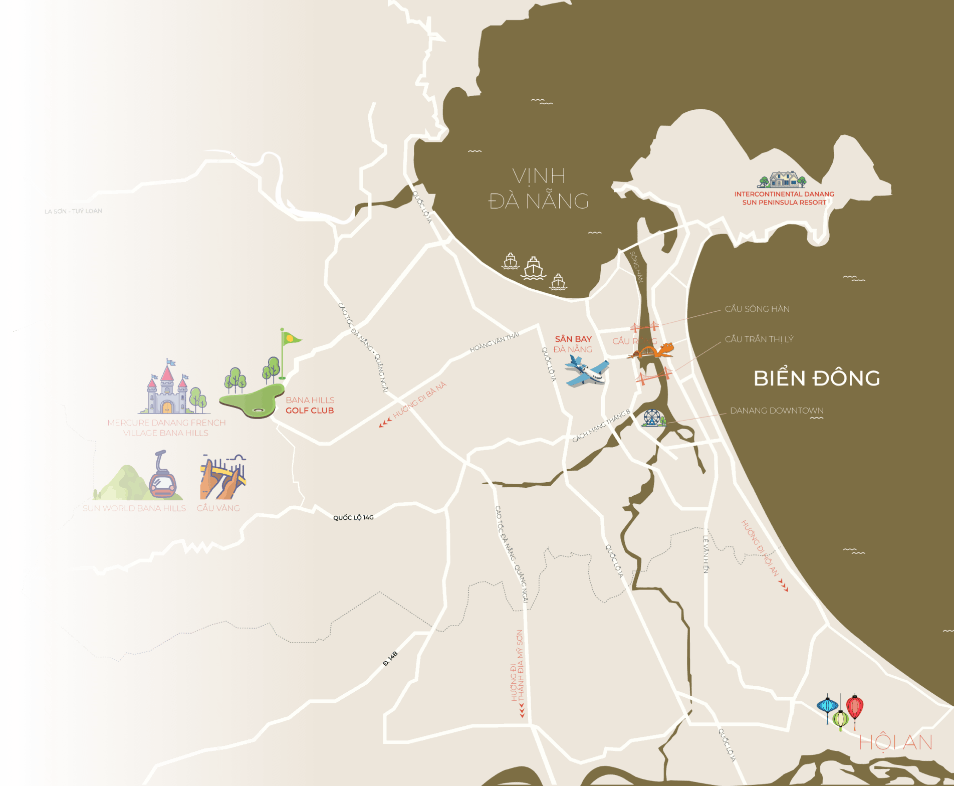 Bên cạnh đó, quần thể có lợi thế vị trí “trung tâm của trung tâm”, mặt sông – cận phố. Từ đây, cư dân có thể dễ dàng di chuyển đến các khu vực hành chính, du lịch hay tiếp cận hạ tầng dịch vụ, công cộng của thành phố như: trung tâm hành chính, Cầu Rồng, cầu tình yêu, bãi biển Mỹ Khê hay Công viên Châu Á, chùa Linh Ứng, sân bay quốc tế Đà Nẵng… Khi hầm vượt sông Hàn chạy xuyên qua dự án thành hình, kết nối các tuyến đường trung tâm, thời gian di chuyển giữa hai bờ sông sẽ tiếp tục được rút ngắn.